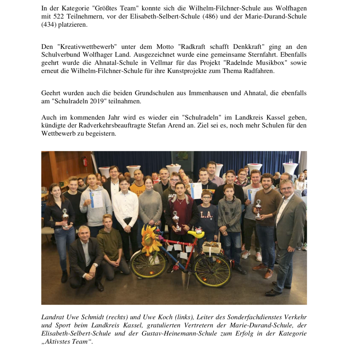 In der Kategorie „Das kreativste Fahrradprojekt“ konnten die Klassen 7a (Frau Röse) und 7b (Frau Weber) der Ahnatal-Schule mit ihrer „Radelnden Musikbox“ den 2.Preis erlangen, der mit 750 Euro datiert ist.
