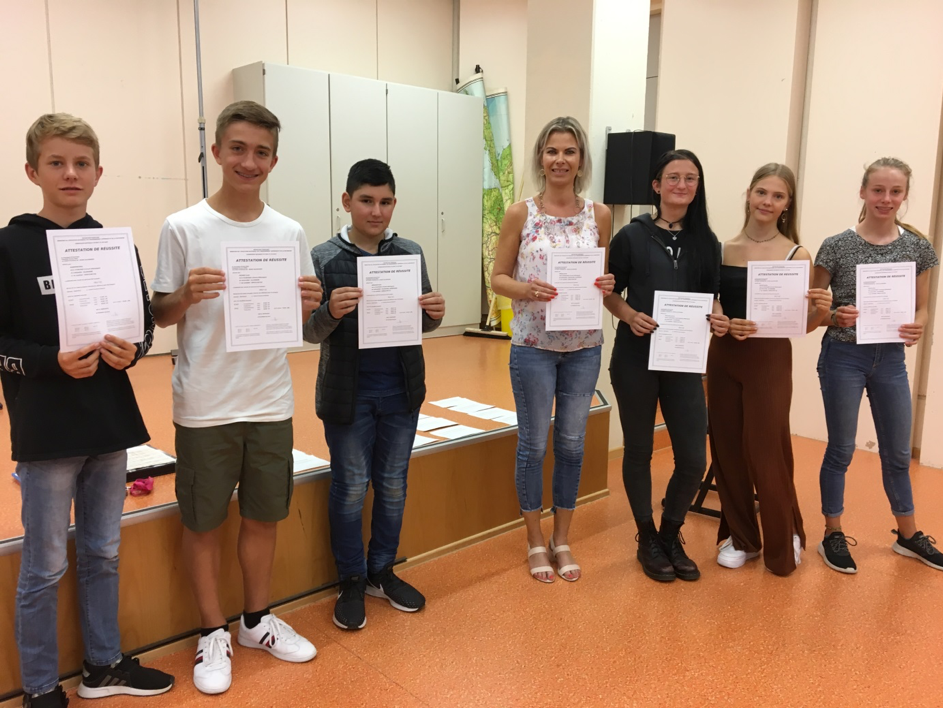 Auch im Schuljahr 2018/19 haben 4 Französisch-Schülerinnen und Schüler aus dem Jahrgang 7 und drei Französisch-Schülerinnen aus dem Jahrgang 9 die DELF AG besucht, um ihre fachlichen Kompetenzen in den Bereichen Schreiben, Hören, Verstehen und Sprechen zu erweitern, damit sie im Frühjahr ihr französisches, international anerkanntes, Sprachdiplom auf zwei unterschiedlichen Anforderungsniveaus bestehen. Sie waren von Anfang an mit Begeisterung dabei, und egal ob Anfänger oder Fortgeschrittene, haben alle ihre schriftlichen und mündlichen Sprachprüfungen mit Erfolg abgelegt. Am Freitag, den 23.08.2019, wurden den Schülerinnen und Schülern ihre Sprachdiplome von Frau Engelke überreicht, die auch die AG leitete.