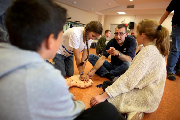 Also machen Sie es ihren Kindern gleich. Prüfen Sie, ob die Person noch atmet und wenn nicht, rufen Sie 112 an. Beginnen Sie dann sofort mit der Druckmassage und hören nicht auf, bis Hilfe eintrifft.