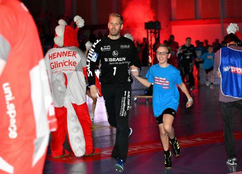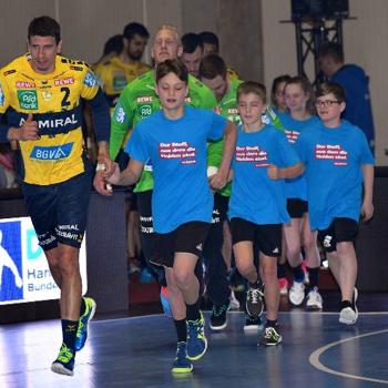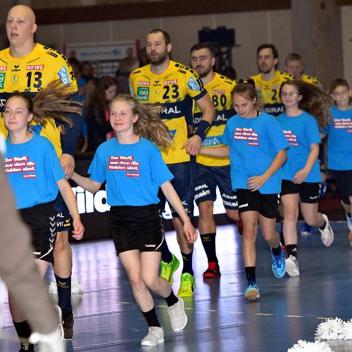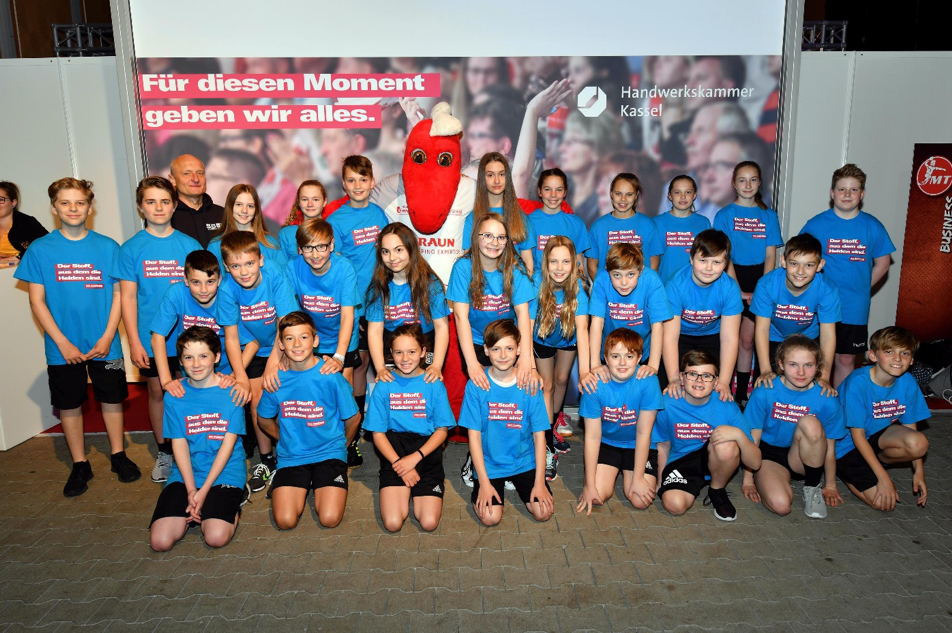 Wir trafen uns um 10.45 Uhr an der Schule und bildeten Fahrgemeinschaften, insgesamt waren 28 Kinder und 7 Betreuer am Start. Vor der Halle wurden die Aufgaben verteilt und den Kindern der gut getaktete Ablaufplan geschildert, dort bekamen wir auch die von der Handwerkskammer Kassel gesponserten Einlaufshirts übergeben. Nach dem Umkleiden ging es sofort zum obligatorischen Gruppenfoto mit dem Maskottchen Henner. Danach nahmen wir kurz unsere Plätze ein und dann ging es auch schon los. In der mit 4300 Zuschauern restlos ausverkauften Halle liefen die ersten Schüler und Schülerinnen mit den Rhein Neckar Löwen ein, u.a. an der Hand der Nationalspieler Jannik Kohlbacher, Patrick Groetzki. Danach folgte die 2. Gruppe mit den MT-Profis um Kapitän Timm Lemke.