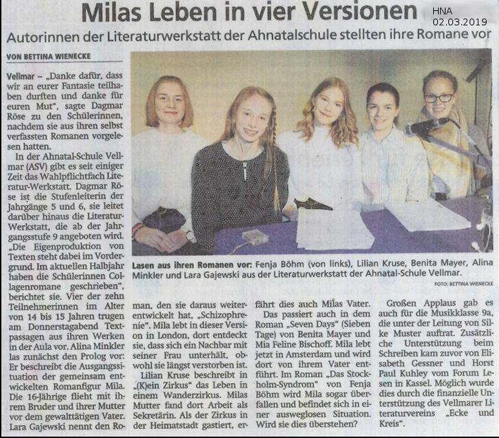 Ab der Jahrgangsstufe 9 wird das Wahlpflichtfach „Literatur-Werkstatt“ angeboten. Hier steht die Eigenproduktion von Texten im Vordergrund. Im aktuellen Halbjahr haben die Schülerinnen Collagenromane geschrieben, in denen sowohl eine gemeinsam entwickelte Hauptperson, Mila Delavin, eine Rolle spielt, als auch ein gemeinsamer Romananfang gefunden wurde, der individuell weiterentwickelt wird.