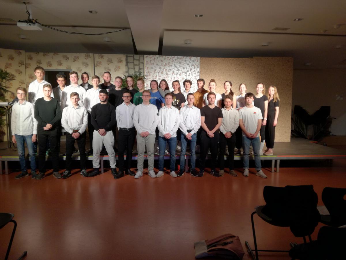 Bevor der Kurs das Stück vor Familien und Freunden aufführte, entschloss man sich zu einer Generalprobe, die am 19.02. vor allen Deutsch- Kursen im Jahrgang 10 stattfand. Hier waren alle sehr nervös, was bei einer gefüllten Aula mit gleichaltrigen Mitschülern durchaus verständlich war. Hier erhielt man nochmal wichtige Hinweise, die dann zwei Tage später vor den Eltern und Freunden super umgesetzt wurden. Ein großes Dankeschön an den Kurs, ihr ward grandios! Sowohl als Drehbuchautoren als auch als Schauspieler.