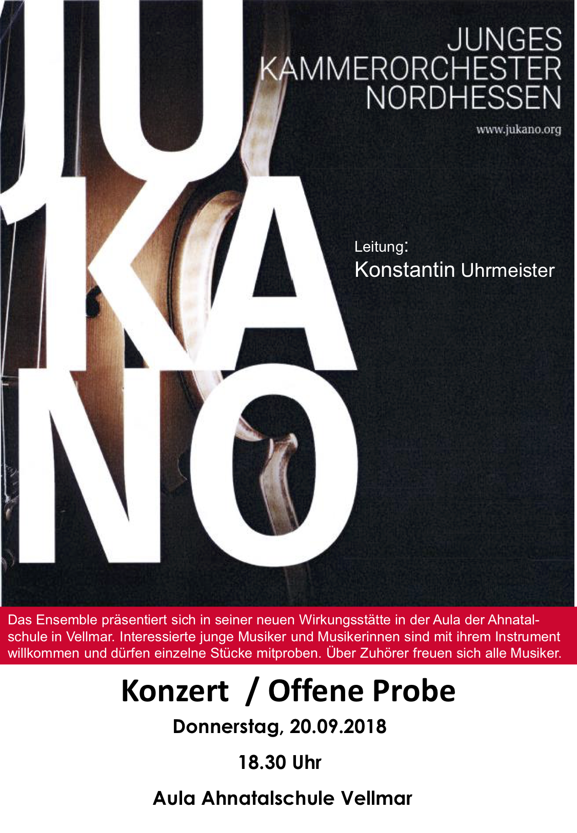 Das Junge Kammerorchester Nordhessen e.V. (JuKaNo) geht neue Wege. Nach seiner Gründung im Jahr 2015 agierte das junge Orchester vorwiegend in der Lindenmühle in Burguffeln. Konzerte, Mitwirken bei öffentlichen Veranstaltungen, eine Sylt-Tournee sowie die Herausgabe einer ersten CD mit buntem Musikprogramm quer durch viele Stilrichtungen und Musikepochen brachten dem jungen Ensemble bereits einen nennenswerten Bekanntheitsgrad in Nordhessen. In diesem Jahr übernahm Konstantin Uhrmeister die Leitung des Orchesters. Das erste Konzert unter seiner Leitung fand im Juni in Kassel statt. Eine Kooperation mit der Ahnatal-Schule und der Chroma – Schule für Musik und Tanz in Vellmar und ihres Fördervereins bringt nun wieder frischen Wind in die Arbeit des Vereins, der sich zur Aufgabe gestellt hat, das Musizieren jugendlicher Menschen im Orchester zu unterstützen. Die Neuorientierung nach Vellmar an die Ahnatal-Schule soll nun mehr jugendliche Musiker und Musikerinnen einladen, bei JuKaNo mitzuwirken.