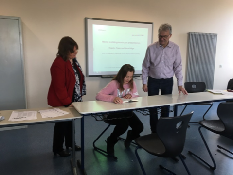 Danach wurde konkret an Textstellen der Schülerinnen gearbeitet. Die Referenten rieten, Gefühle nicht nur zu „beschreiben“, sondern diese in passende Handlungen zu verpacken, damit sie dann vom Leser selbständig entschlüsselt werden können.