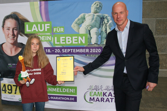Freut sich über einen Gutschein für ein neues Fahrrad: Lea Steiner. Überreicht wurde er von René Schneider, Leiter Kommunikation und Geschäftsführungsbüro bei EAM.