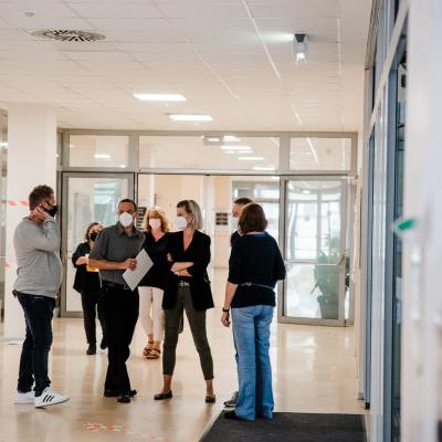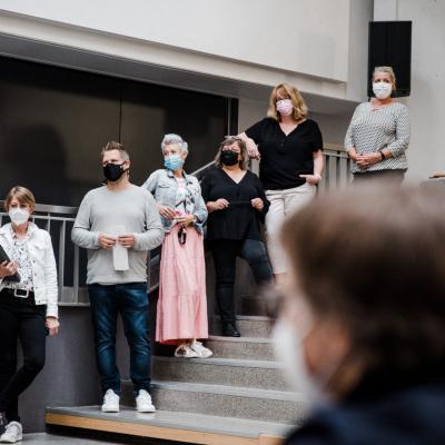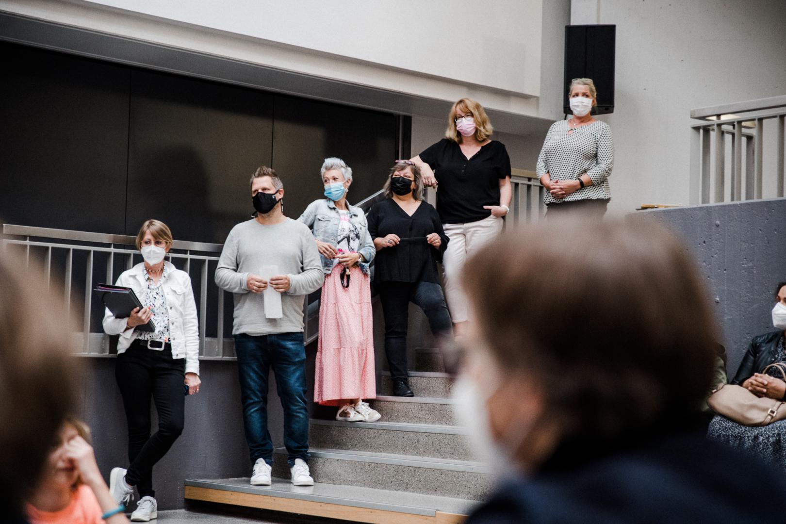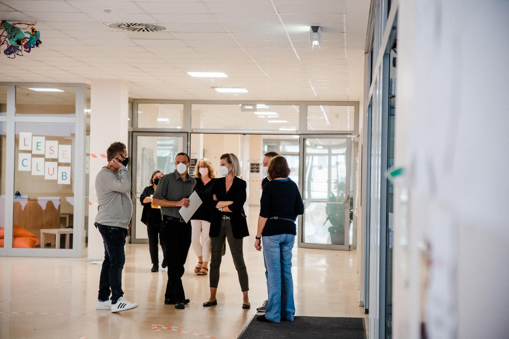 Anschließend begrüßt uns Frau Röse, die Stufenleiterin 5/6, und erzählt von einer „Reise“, auf die ich mich mit meinen Eltern und Lehrern ab heute begeben werde. Klingt spannend! Mir wird es warm ums Herz. Ja, ich bin bereit und als mich Frau Röse zusammen mit meinem Freund aufruft, laufe ich die Stufen hinunter, stelle mich in einen der bunten Reifen, die für uns ausgelegt wurden und sehe das erste Mal meine neue Klassenlehrerin, die zwar eine Maske trägt, aber uns mit ihren Augen herzlich anlacht. Wir dürfen jetzt kurz die Maske für ein Erinnerungsfoto abziehen, dann winken wir den Eltern zu, reihen uns hinter unserer Klassenlehrerin ein und marschieren Richtung Klassenraum. Die Reise kann beginnen……..