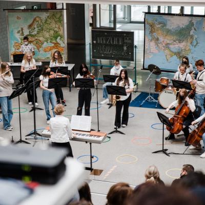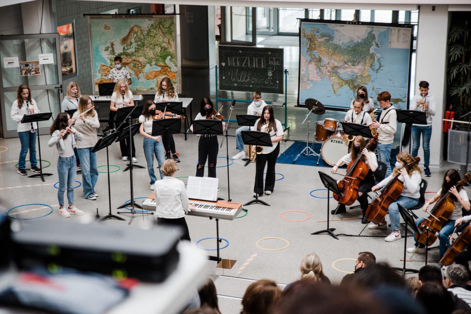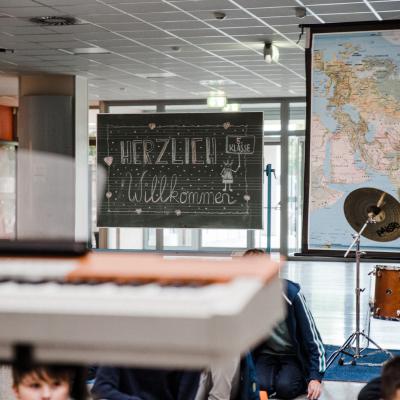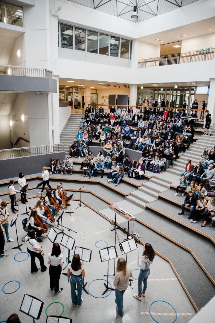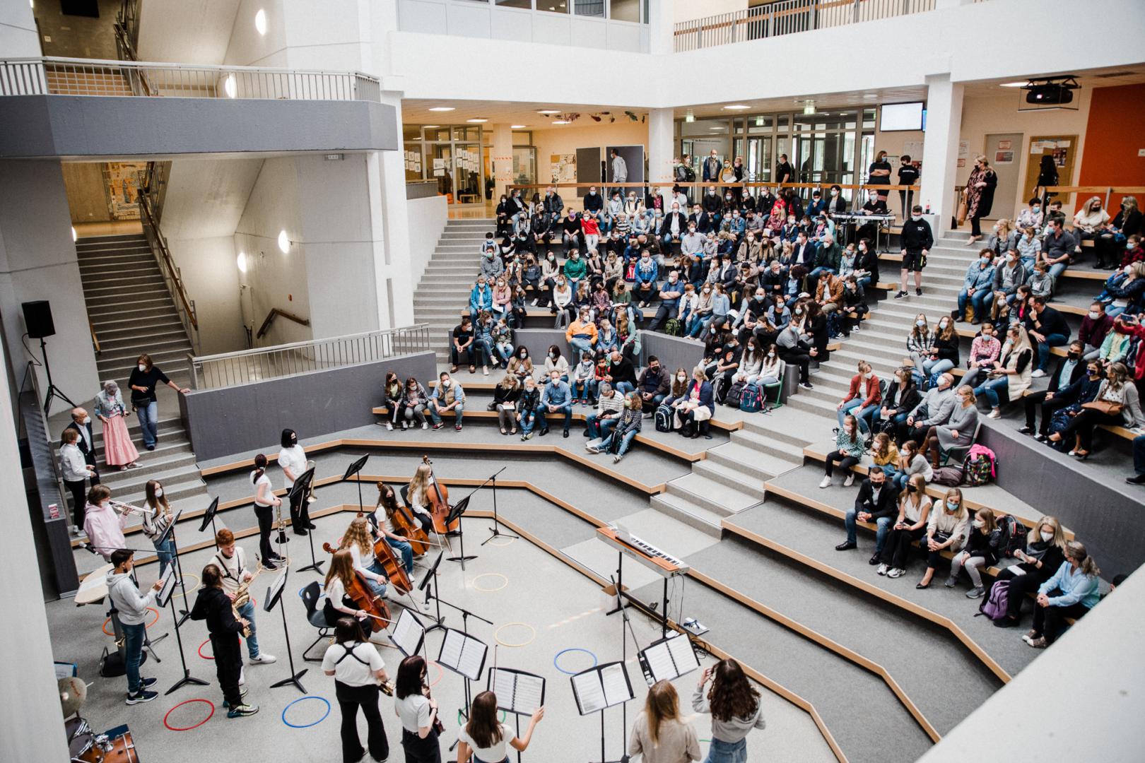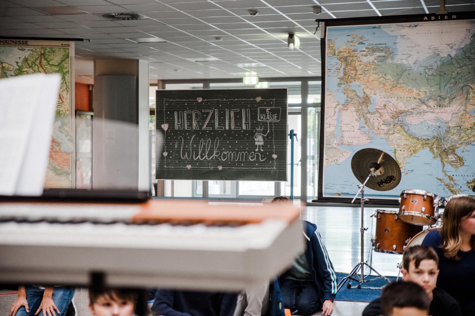 Ich darf in die Schule, die Musik wird lauter, unten im Atrium werden wir Neuen von der Musikklasse 9a mit einem Swing begrüßt und glücklich setze ich mich mit meinen Eltern auf eine der großen Stufen im Atrium. Zuerst spricht der Schulleiter, Herr Freiling, zu uns und erzählt von den vielen AGs, die die Schule anbietet. Das macht mich sehr neugierig.