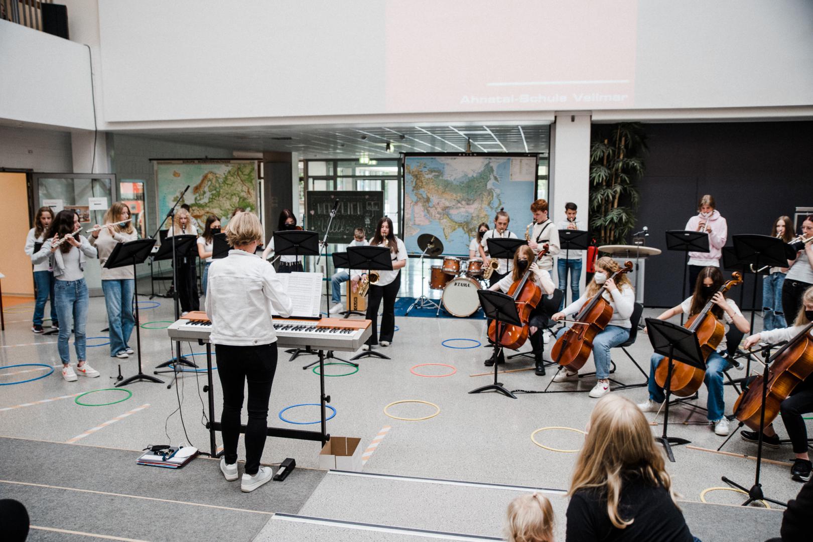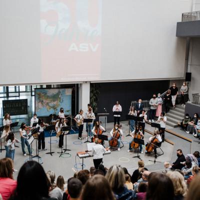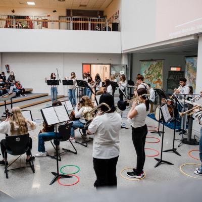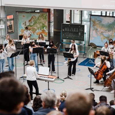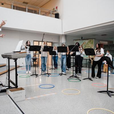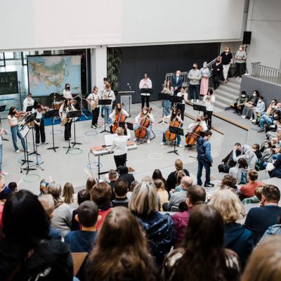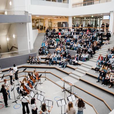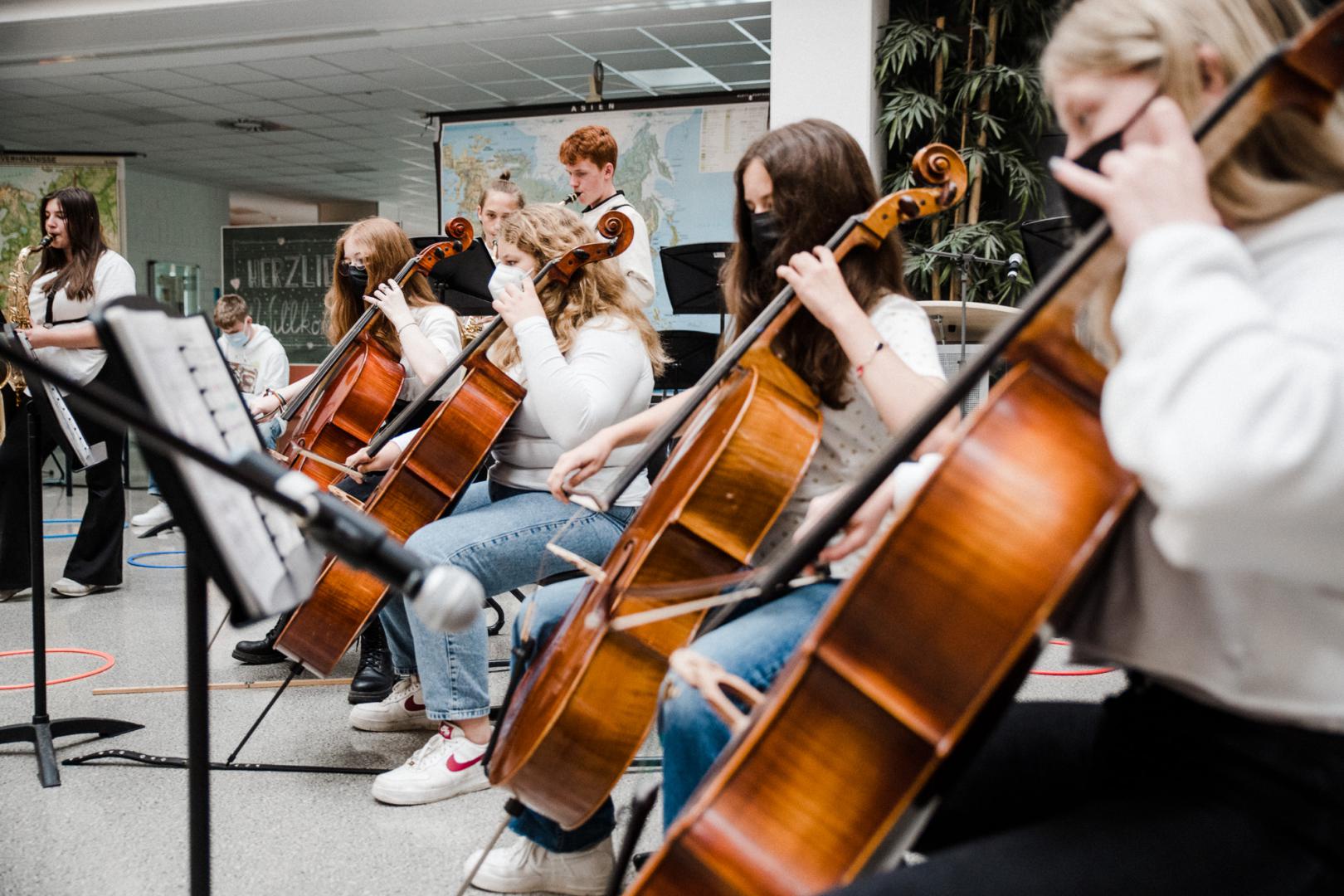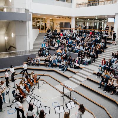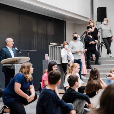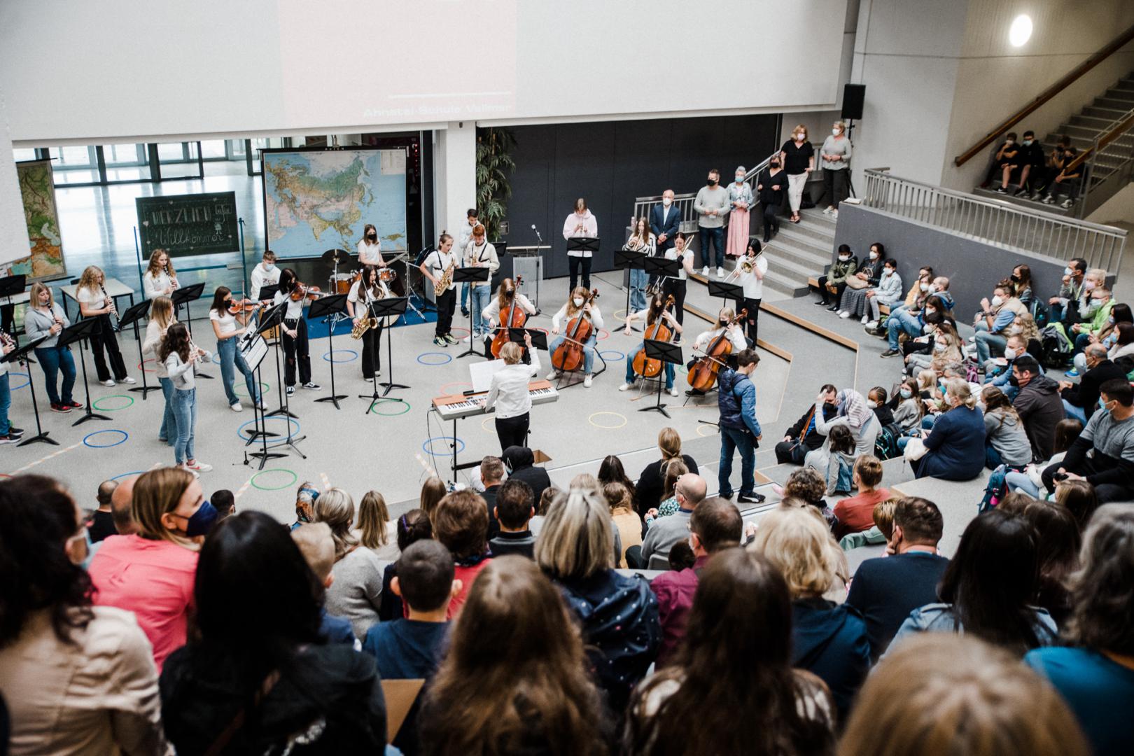 Ich darf in die Schule, die Musik wird lauter, unten im Atrium werden wir Neuen von der Musikklasse 9a mit einem Swing begrüßt und glücklich setze ich mich mit meinen Eltern auf eine der großen Stufen im Atrium. Zuerst spricht der Schulleiter, Herr Freiling, zu uns und erzählt von den vielen AGs, die die Schule anbietet. Das macht mich sehr neugierig.