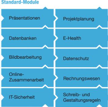 Darauf aufbauend schließt sich der ECDL-Standard an, für den drei weitere Module absolviert werden müssen, die aus den rechts abgebildeten Modulen frei ausgewählt werden können.