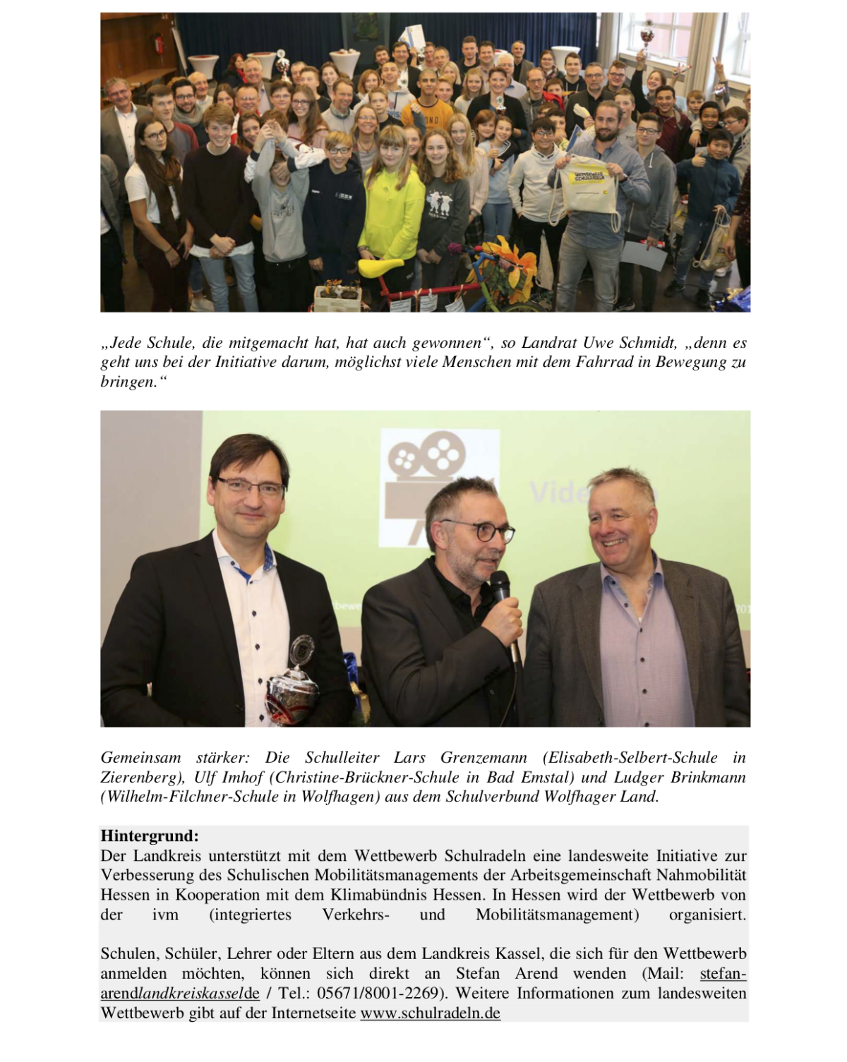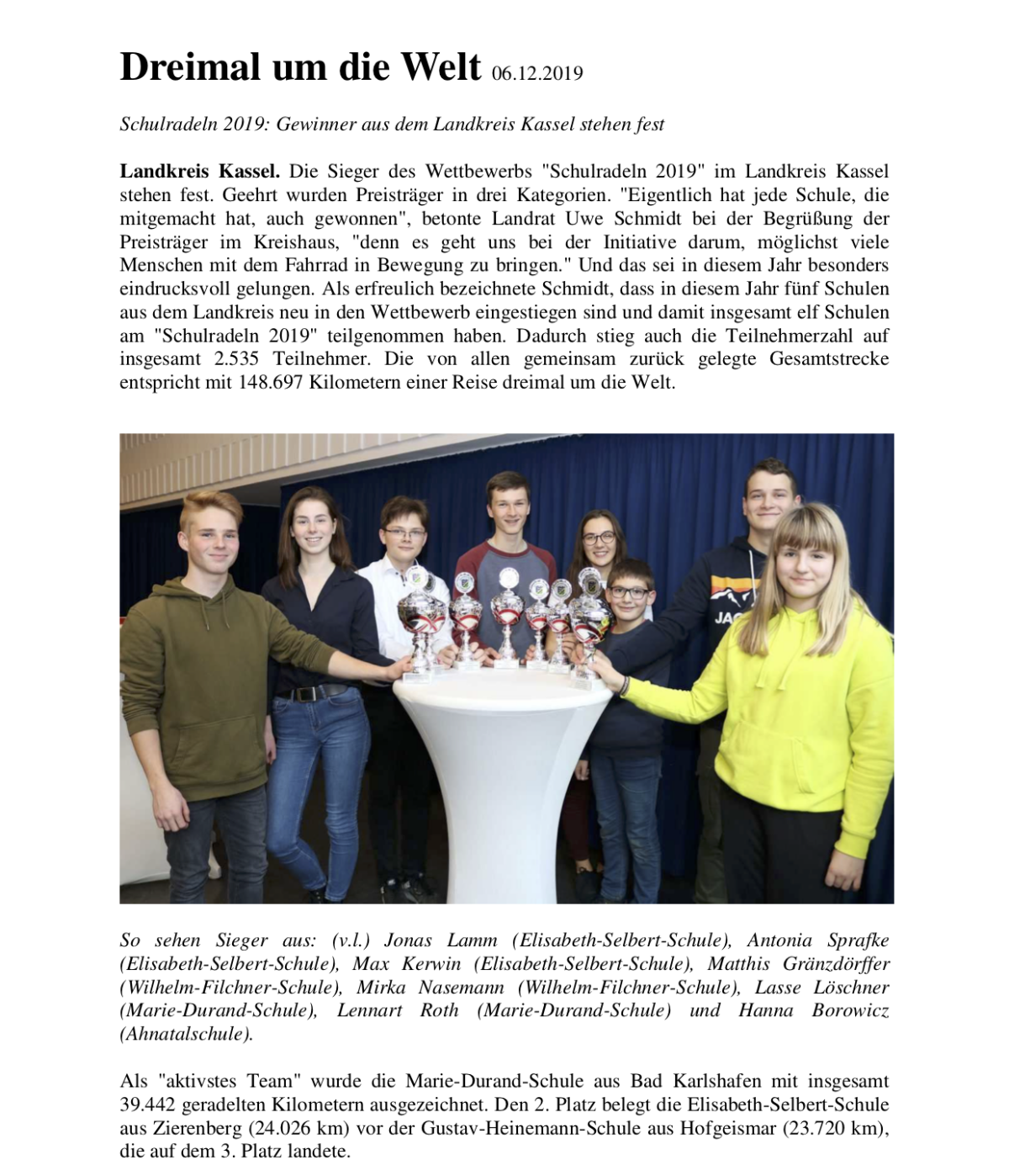 In der Kategorie „Das kreativste Fahrradprojekt“ konnten die Klassen 7a (Frau Röse) und 7b (Frau Weber) der Ahnatal-Schule mit ihrer „Radelnden Musikbox“ den 2.Preis erlangen, der mit 750 Euro datiert ist.