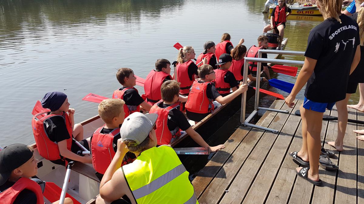Unsere beiden Klassen belegten jeweils ein Drachenboot mit 16 Paddlern und einem Trommler. Zudem steuerten wir auch noch zwei 5er Canadier.