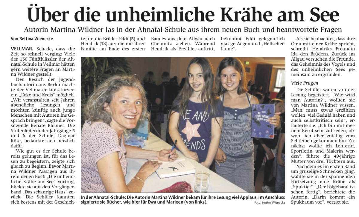Am Dienstag, den 14.5.2018 besuchte die Autorin, Martina Wildner, den Jahrgang 5. Im Gepäck hatte sie den Fortsetzungsroman von „Das schaurige Haus“, den alle Klassen im Deutschunterricht gelesen hatten. Waren es hier die Nacktschnecken, die als Boten geheimer Informationen entschlüsselt werden mussten, nahm uns Frau Wildner in Ihrem 2017 erschienenen Buch „ Die unheimliche Krähe am See“ mit auf eine Reise ins Allgäu zu einem geheimnisvollen Stausee, aus dem ein Kirchturm ragt und eine rätselhafte Krähe ihr Unwesen treibt.