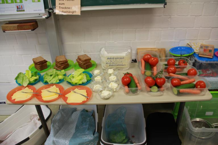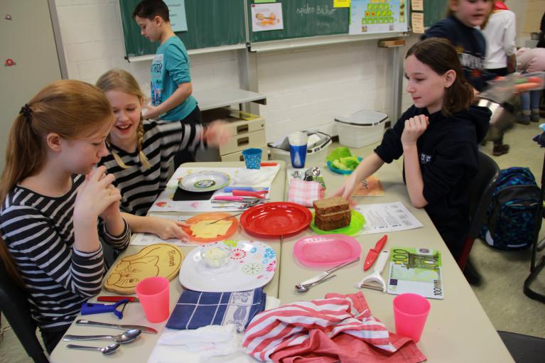 Im zweiten Teil durften die Kinder ihr neu erworbenes Wissen auch gleich praktisch umsetzen. Hierzu wurden ein Klassenraum zum Küchenraum umfunktioniert, die Haare zusammengebunden und die Hände gründlich gewaschen. Als erstes stand ein gesundes Sandwich auf dem Speiseplan, das mit Käse und viel Salat belegt wurde und köstlich schmeckte.