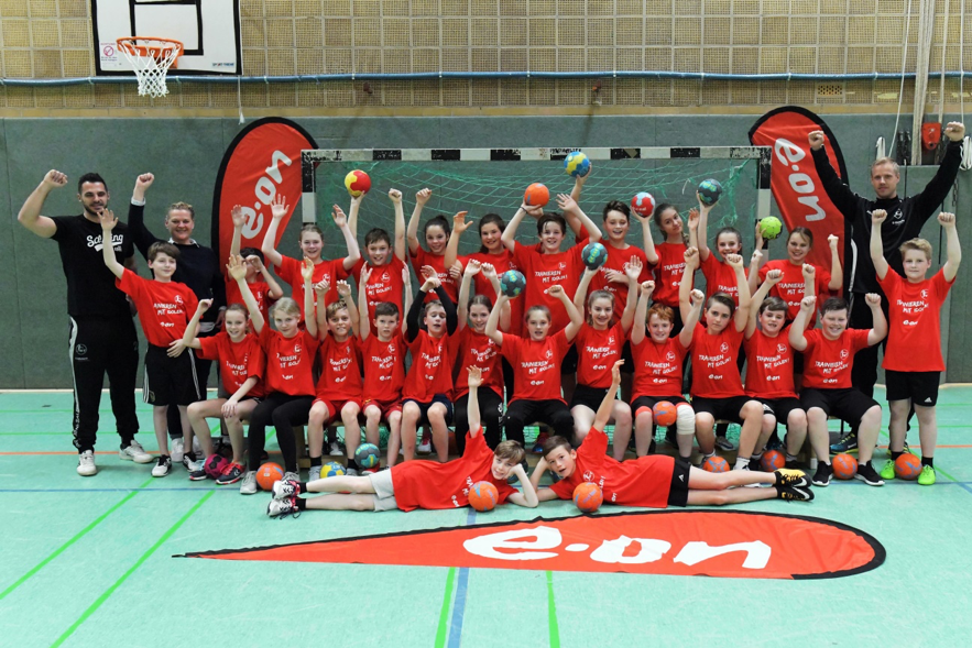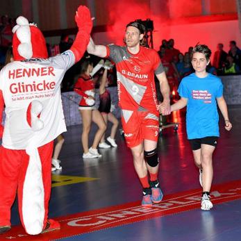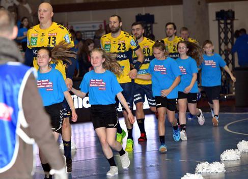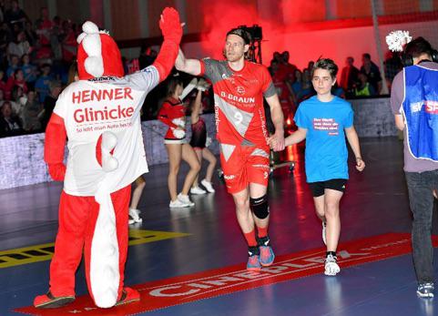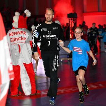 Wir trafen uns um 10.45 Uhr an der Schule und bildeten Fahrgemeinschaften, insgesamt waren 28 Kinder und 7 Betreuer am Start. Vor der Halle wurden die Aufgaben verteilt und den Kindern der gut getaktete Ablaufplan geschildert, dort bekamen wir auch die von der Handwerkskammer Kassel gesponserten Einlaufshirts übergeben. Nach dem Umkleiden ging es sofort zum obligatorischen Gruppenfoto mit dem Maskottchen Henner. Danach nahmen wir kurz unsere Plätze ein und dann ging es auch schon los. In der mit 4300 Zuschauern restlos ausverkauften Halle liefen die ersten Schüler und Schülerinnen mit den Rhein Neckar Löwen ein, u.a. an der Hand der Nationalspieler Jannik Kohlbacher, Patrick Groetzki. Danach folgte die 2. Gruppe mit den MT-Profis um Kapitän Timm Lemke.