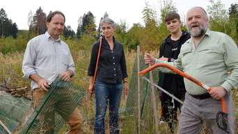 Unterwegs im Habichtswald: Schulleiter der Freien Waldorf-Schule Kassel Ulf Liebmann (von links), Lehrerin Sigrid Seidel, Schüler Silas Vogler und