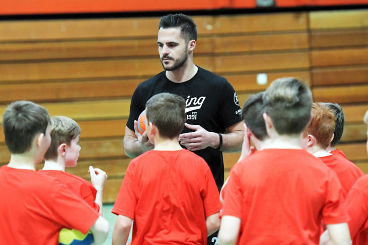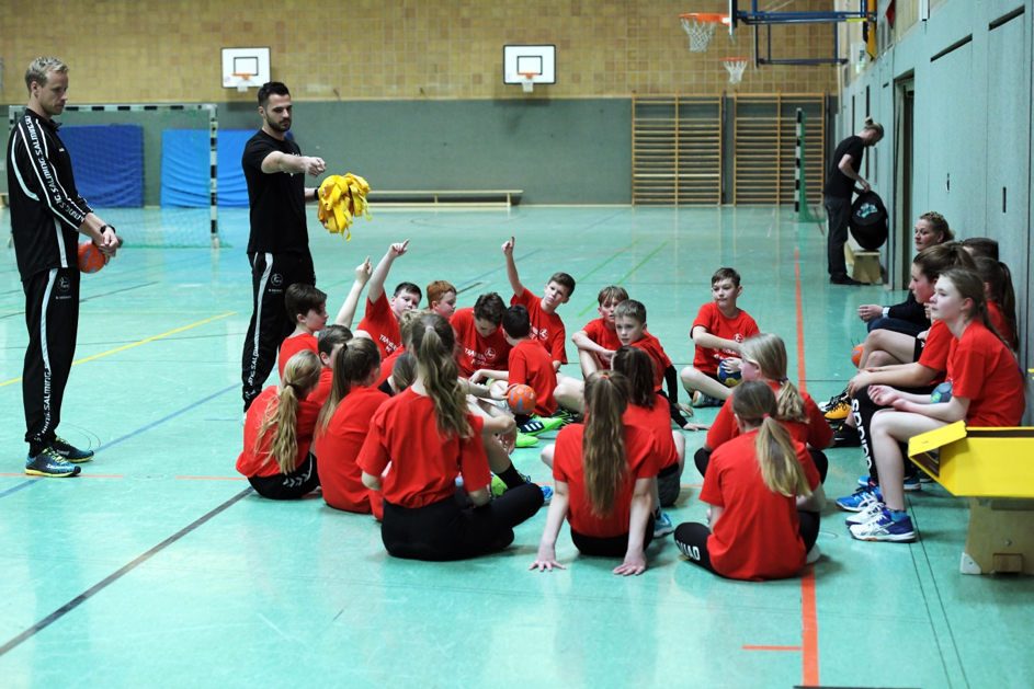 Die beiden Profis haben 90 Minuten mit uns Handball gespielt. Es gab handballspezifische Aufwärmübungen, Wurftechniken aufs Tor und zum Schluss haben wir sogar in einer kleinen Turnierform in 4 Gruppen Handball gespielt.