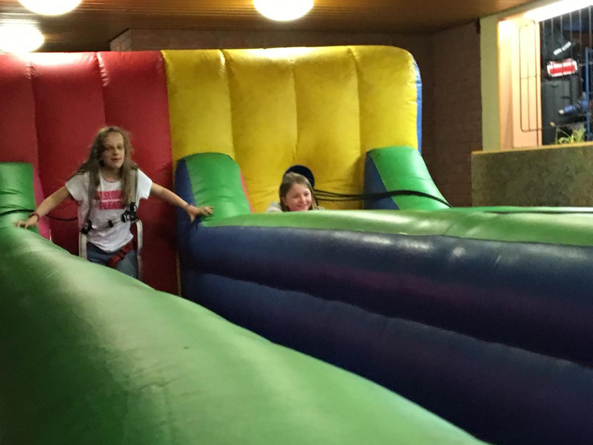 Hauptattraktion dieses Jahr war aber das Bungee-Run, was Herr Heidenreich im Flur der Jugendherberge aufgebaut hatte und an dem die Schüler nach den Proben ihre Kräfte messen konnten. Das Bungee-Run ist ein Großspielgerät, bei dem zwei Teilnehmer mittels Hüftgurte an Gummiseilen befestigt werden und mit der Befestigung im gegenseitigen Wettkampf ein bestimmtes Ziel erreichen müssen.