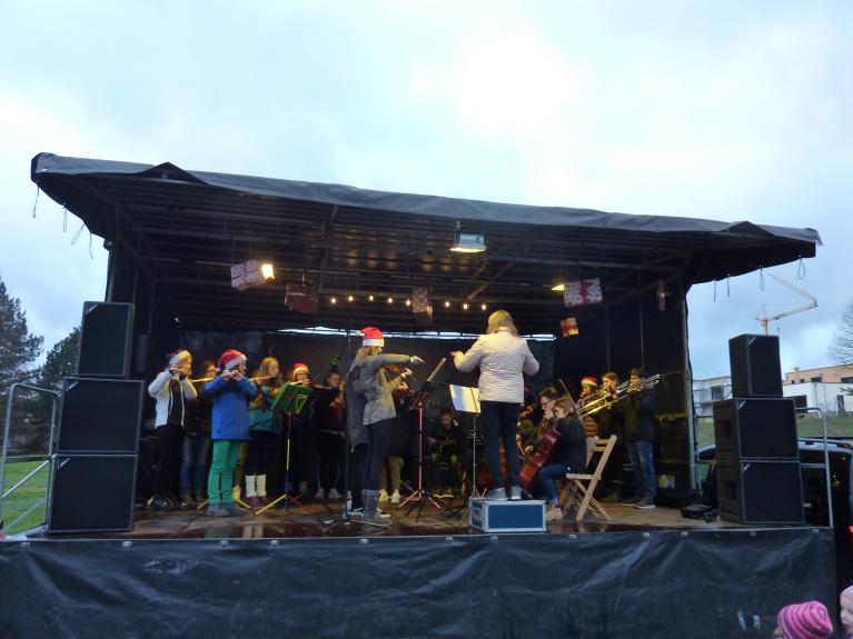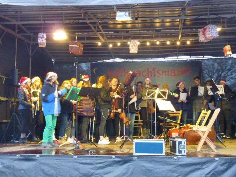 Am 2. Advent spielte und sang die Musikklasse 9a auf dem Vellmarer Weihnachtsmarkt. Der Wettergott meinte es diesmal gnädig, hatte es im letzten Jahr doch gestürmt und geschneit. Der 45minütige Vortrag begann mit einem feierlichen Renaissance-Tanz von Tilmann Susato, gefolgt von der eigentlichen adventlichen Eröffnung „Macht hoch die Tür“. Neben bekannten Weihnachtsliedern erklang eine südafrikanische Weise, ein Friedens- und Abschiedslied der Zulu: Gehet hin in Frieden – das Licht erleuchte die Nacht (Hambani Khale). Stimmlich gereift präsentierten die 30 SchülerInnen „Jingle Bells“ und „Joy to the World" zweistimmig. Den Abschluss bildete ein Bläser- Ensemble und das gemeinsame Lied „O du fröhliche“.
